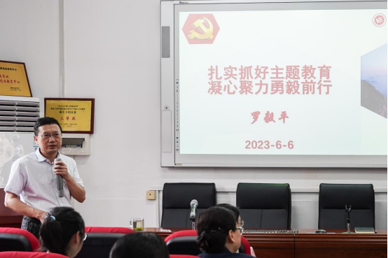 罗毅平以《扎实抓好主题教育,凝心聚力勇毅前行》为题,从主题教育活动、开展目的、如何推动取得扎扎实实的成效等内容,为教师党员们上了一堂生动党课。