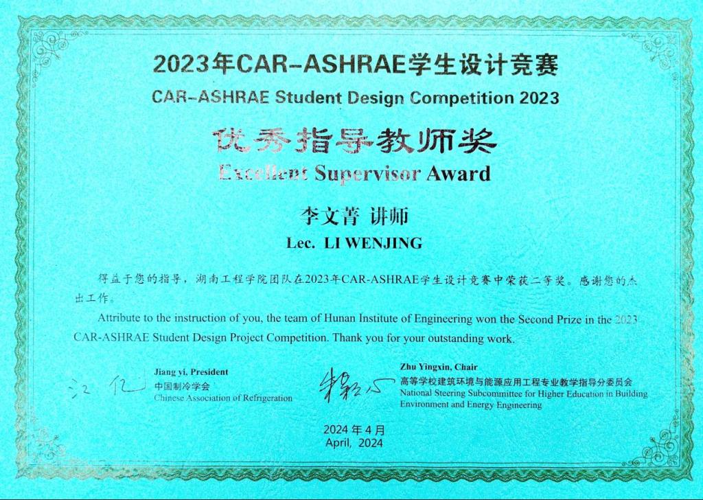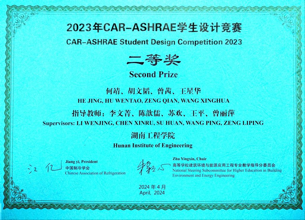 近日,2023年CAR-ASHRAE学生设计竞赛颁奖礼在北京中国国际展览中心落下帷幕。我校建筑环境与能源应用工程专业学生何靖、胡文滔、曾茜、王星华共同设计的项目《某中级人民法院审判法庭暖通空调工程设计》荣获全国二等奖,这是我校学生首次在该竞赛中取得突破。
