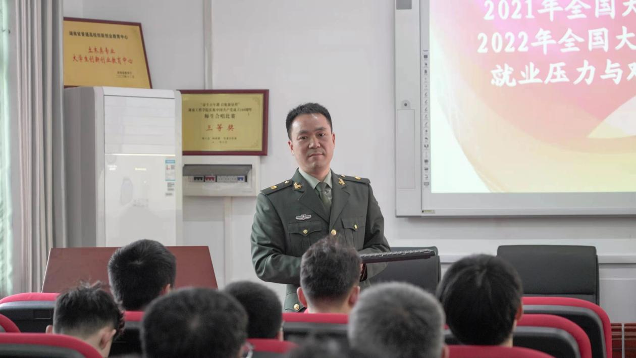 3月29日下午14点30分,开云网页版页面高质量就业座谈会军绿专场第一场在三教304召开。湖南工程学院人民武装部副部长刘宸均、邢承勇老师、开云网页版页面党委副书记梁桥、征兵专干谭杰老师及70余名土木专业学生出席本次会议。