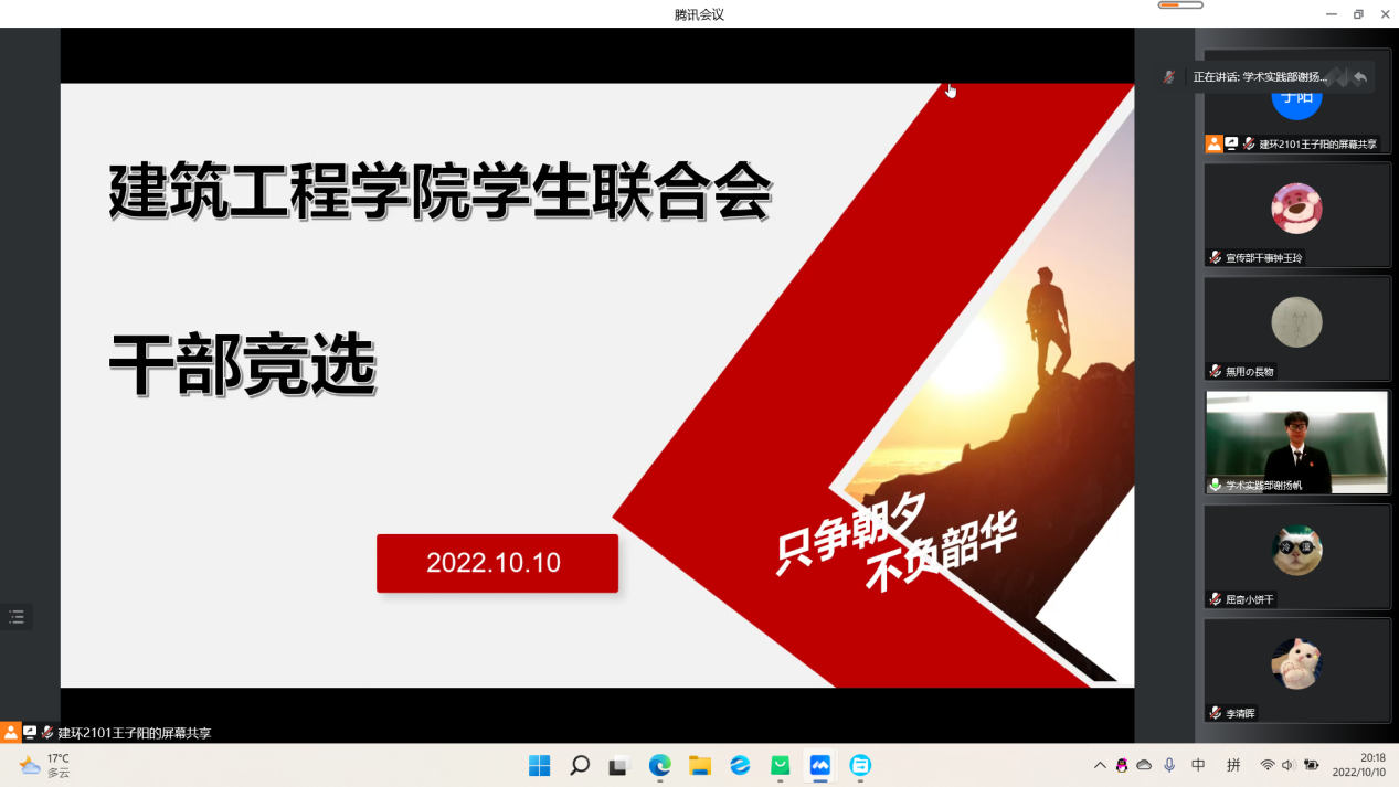 为了推进学生工作更好开展,为学生干部队伍注入新鲜血液,10月10日19:00,开云网页版页面学生联合会通过线上竞选的方式开展了2022-2023学年干部竞选大会。院团总支书记周洳帆老师及全体学生联合会成员参加。