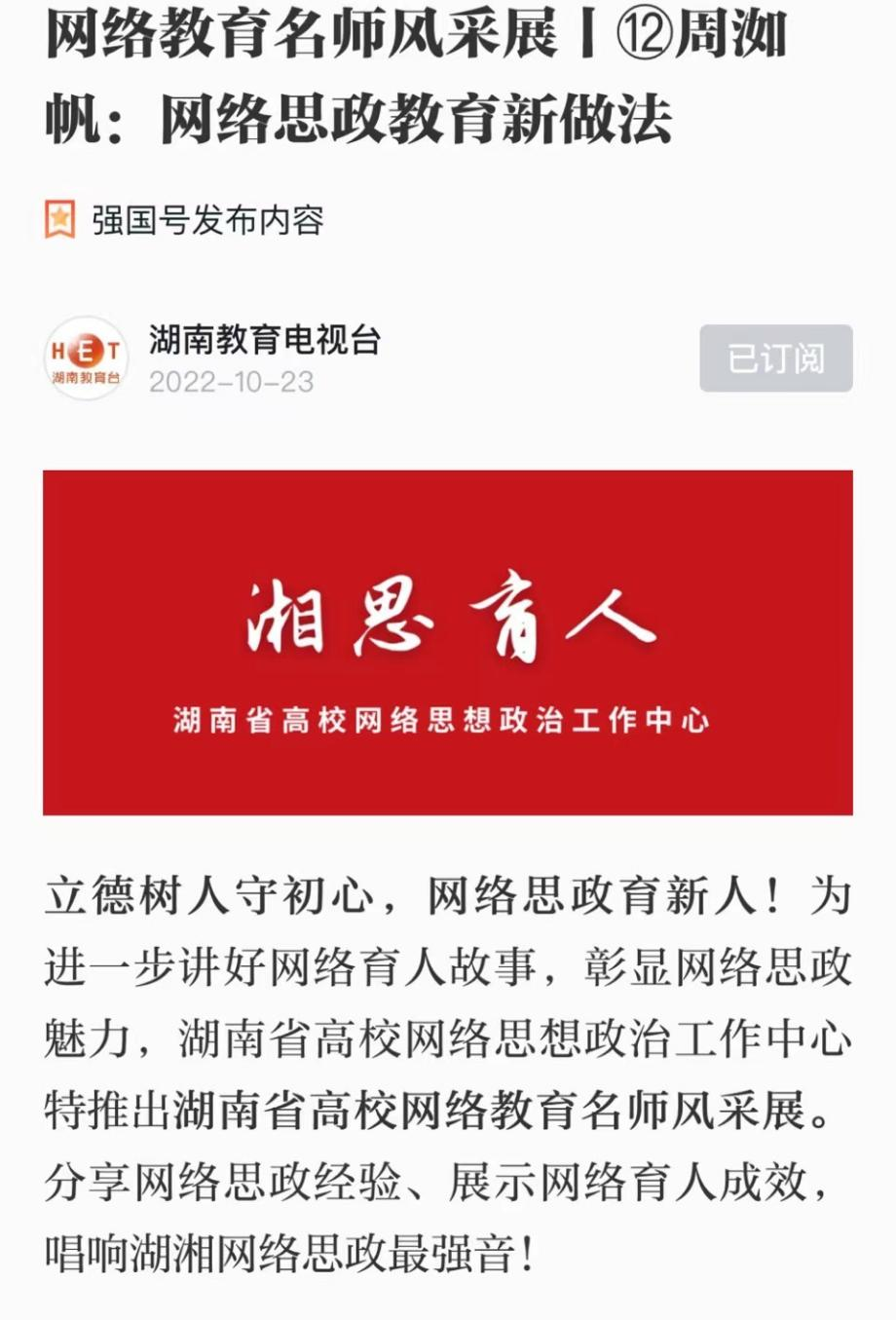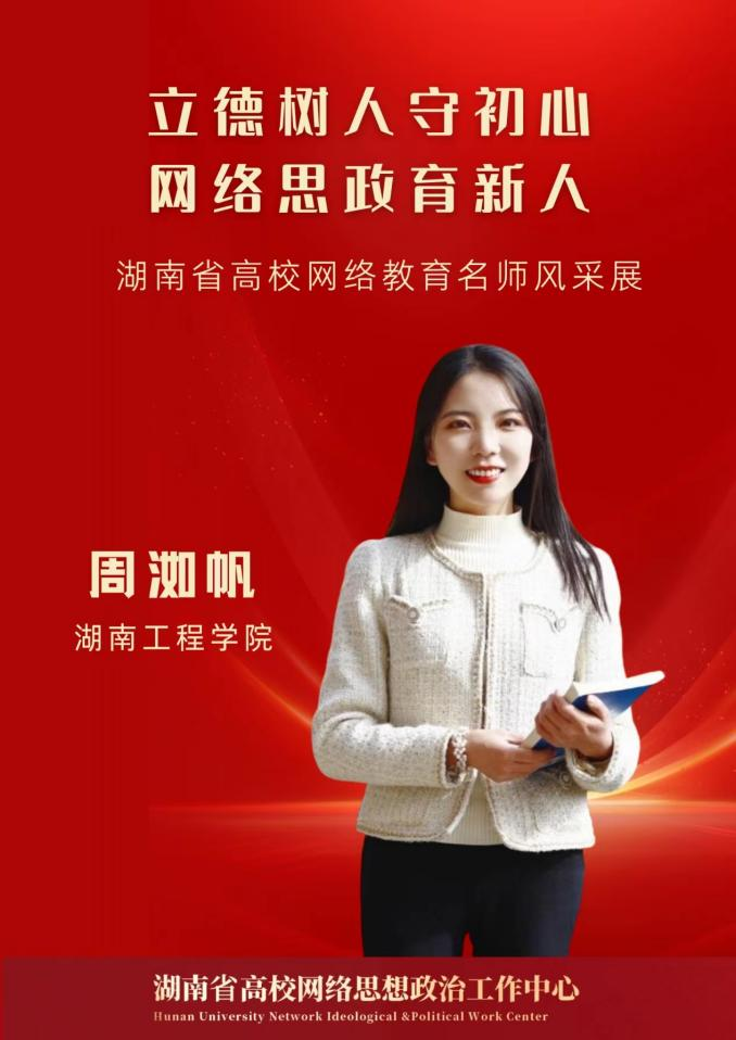 周洳帆任开云网页版页面团总支书记、易班工作站指导老师,2021年11月入选湖南省第二批网络教育名师培育计划。一直以来,周洳帆以“做青年学生的同心同路人”为初心和目标,建立“帆帆不会烦”网络名师工作室,借助微信公众号、视频号、微博、抖音等平台,利用亲和力表达,制作贴近大学生特点的网络作品,采用大学生喜爱的方式开展思想政治教育。她在新媒体平台开设了“大学生活指南”“我的大学故事”“睡前碎碎念”“小周老师的悄悄话”等栏目,粉丝覆盖校内师生、毕业校友、学生家长以及校外各界人士,充分发挥新媒体平台在引领学生思想、服务学生成长等方面的作用,让思想政治教育打破时间、空间局限,随时随地可翻看,做到“时时可育人、处处皆课堂”。