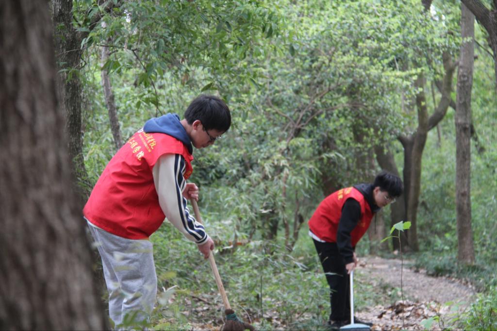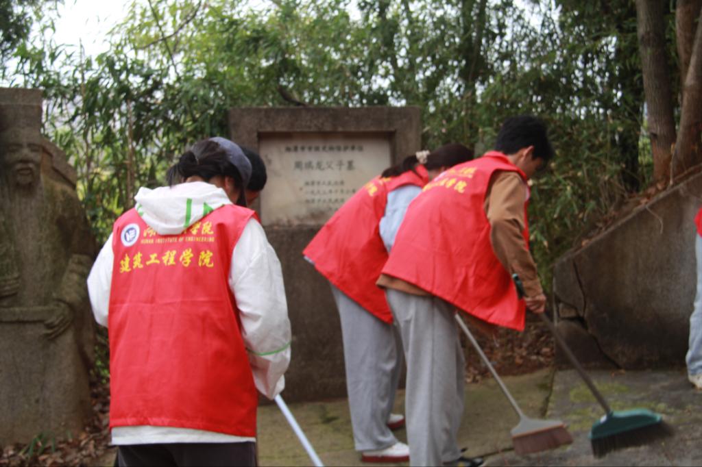 每一次弯腰,每一滴汗水都传递着奉献、友爱、互助、进步的志愿服务精神和爱校如家的感恩情怀。在大家的共同努力下,梅花山道路整洁一新。清扫结束后,同学们还来到我市重点保护文物“周瑞龙父子墓”进行了清扫。