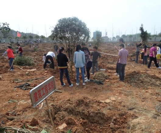 下午两时,参加该活动各院区的校领导、老师和同学到达新校区体育场。我放眼望去。围绕着场边以及场外的是密密麻麻的坑。这些一部分是早些天用挖土机被挖好的,但是同学们为了能够让树苗更好的成长,自己又把坑挖的更深更大。有人从车上搬下树苗,有人提水润土。李佳主任,刘熹微老师忙前忙后,以身作则,带领同学们种下一棵有一棵树苗。整个活动持续了到傍晚时分,大家虽然身体上感到疲倦,但是能够亲身的体验,亲手种下一棵树,都感到十分开心。