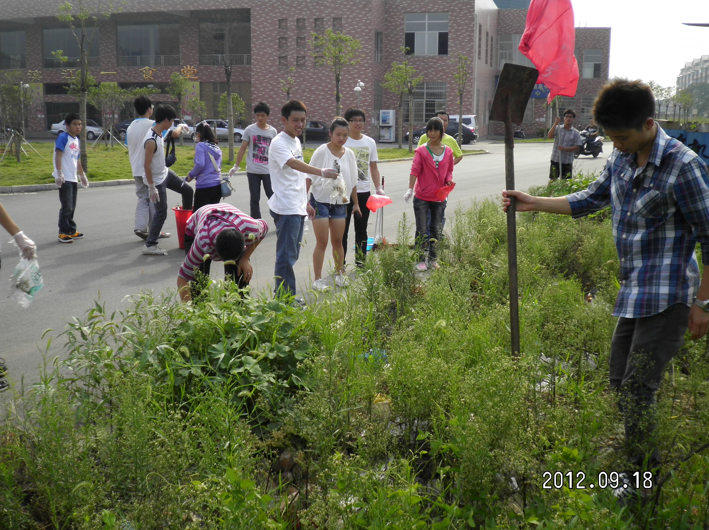 全体参与者分三个小组进行清理,主要清理公寓周边及道路旁边的白色垃圾、杂物等,全体人员不分彼此,分别在公寓周边、草丛里、树林上、墙角里清理种垃圾,不怕脏、不怕累;或用手捡,或用工具拾,或铲沙掩埋,经过众人近一下午的努力,终于将整个公寓清理干净。