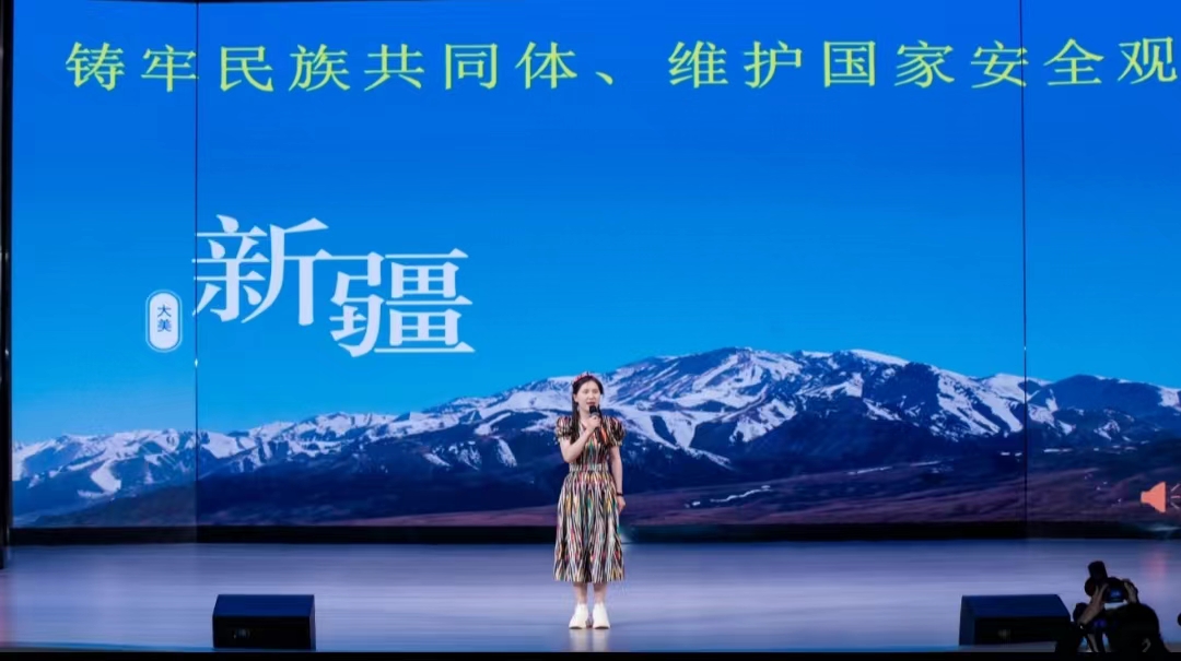 阿依谢木古丽·依孜布拉来自新疆,她向大家介绍了大美新疆、平安新疆、幸福新疆,讲述了自己在学校愉快的学习与生活故事。她表示,要持续深入践行总体国家安全观,铸牢中华民族共同体意识,争做新时代最耀眼的石榴籽,共同为中国式现代化建设贡献智慧和力量。