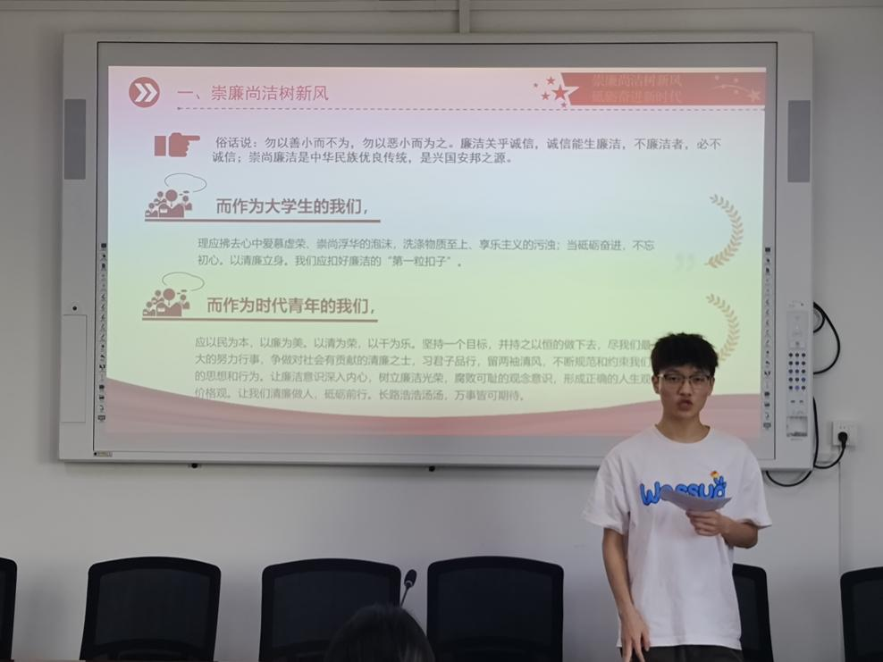 “以廉洁立身,以廉洁立业,以廉洁立世。”,在土木工程专业2202班汤鑫的一句句宣讲词中,大家一同走进了“清廉”的课堂,同时以“廉洁理念”设置趣味问答问答环节,引发青年学生对清廉意义与担当的思考,不求回报的贡献自身价值,争做新时代清廉青年。